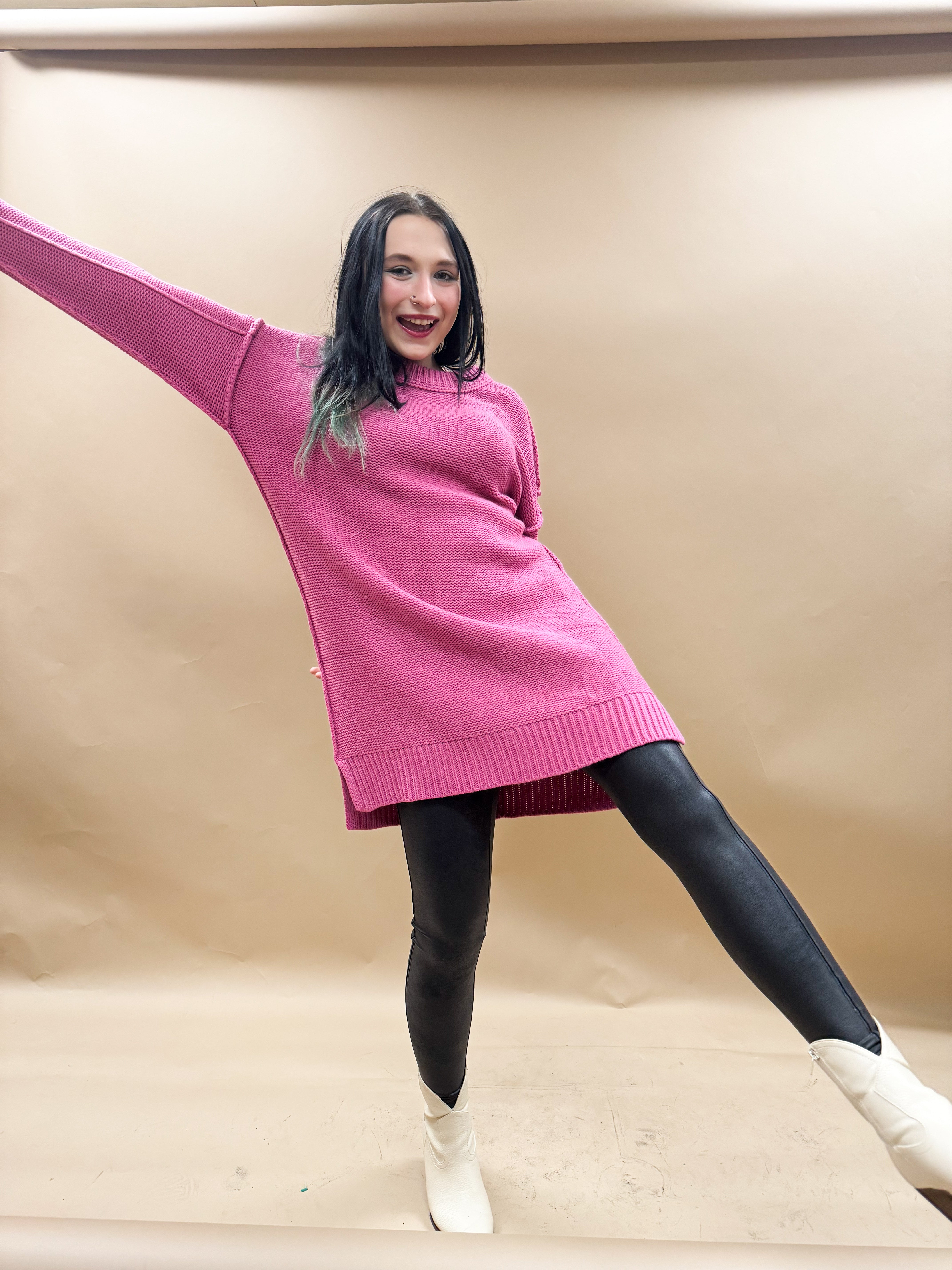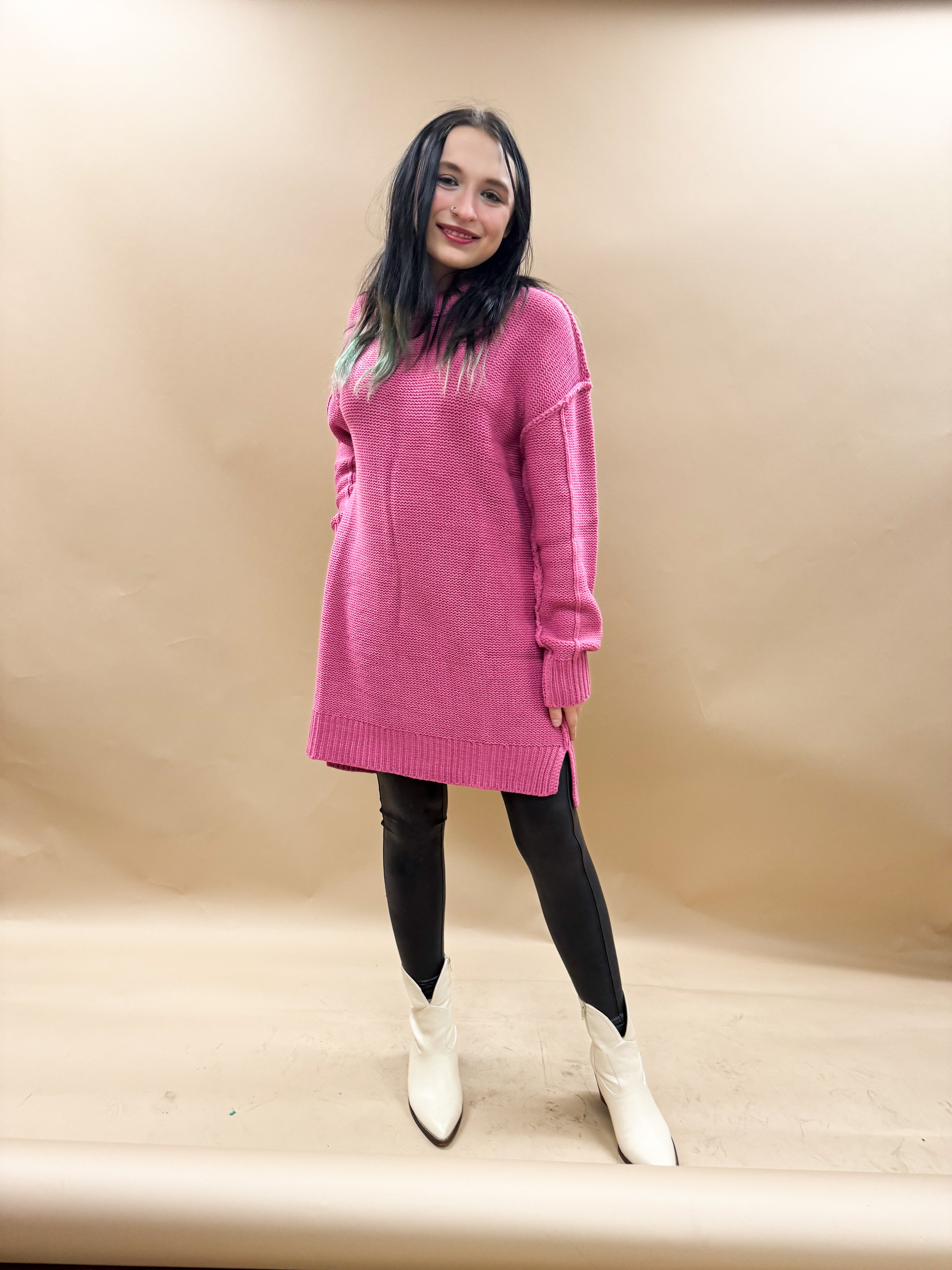 The Esme Oversized Sweater Dress in Rose features a chunky round neck design with an oversized fit, ideal for easy movement. The dress has dropped shoulders and long sleeves, along with seam detailing and a ribbed hem for added style and quality construction. With a convenient side slit, this dress is perfect for a busy, on-the-go lifestyle, providing both comfort and fashion.