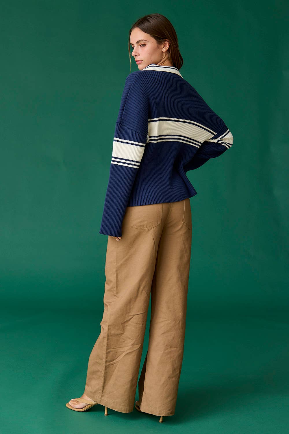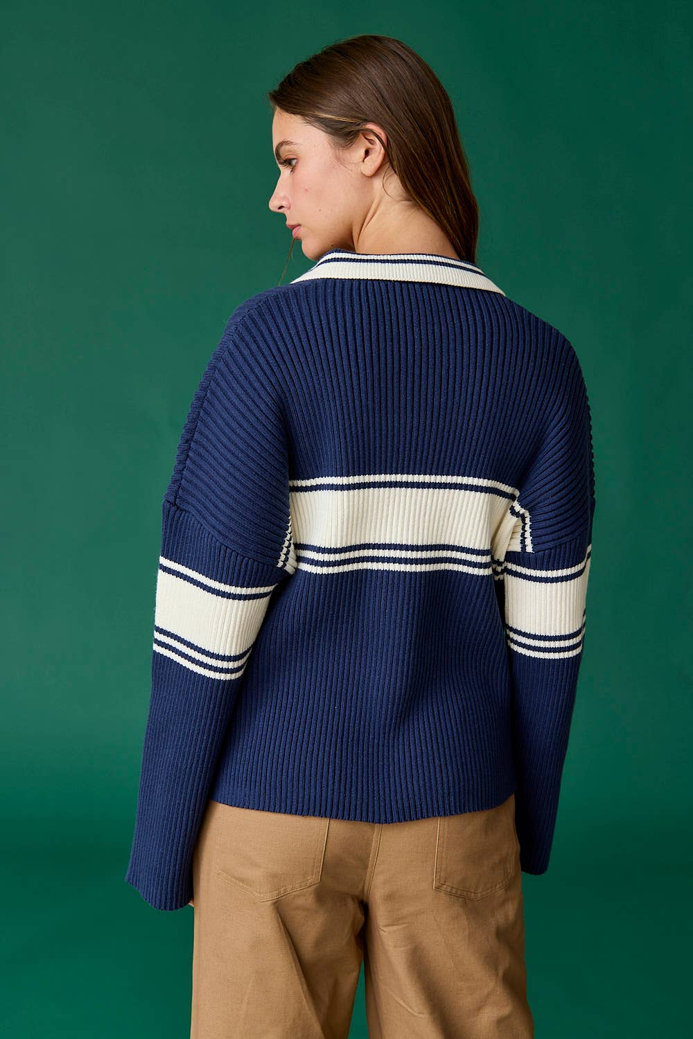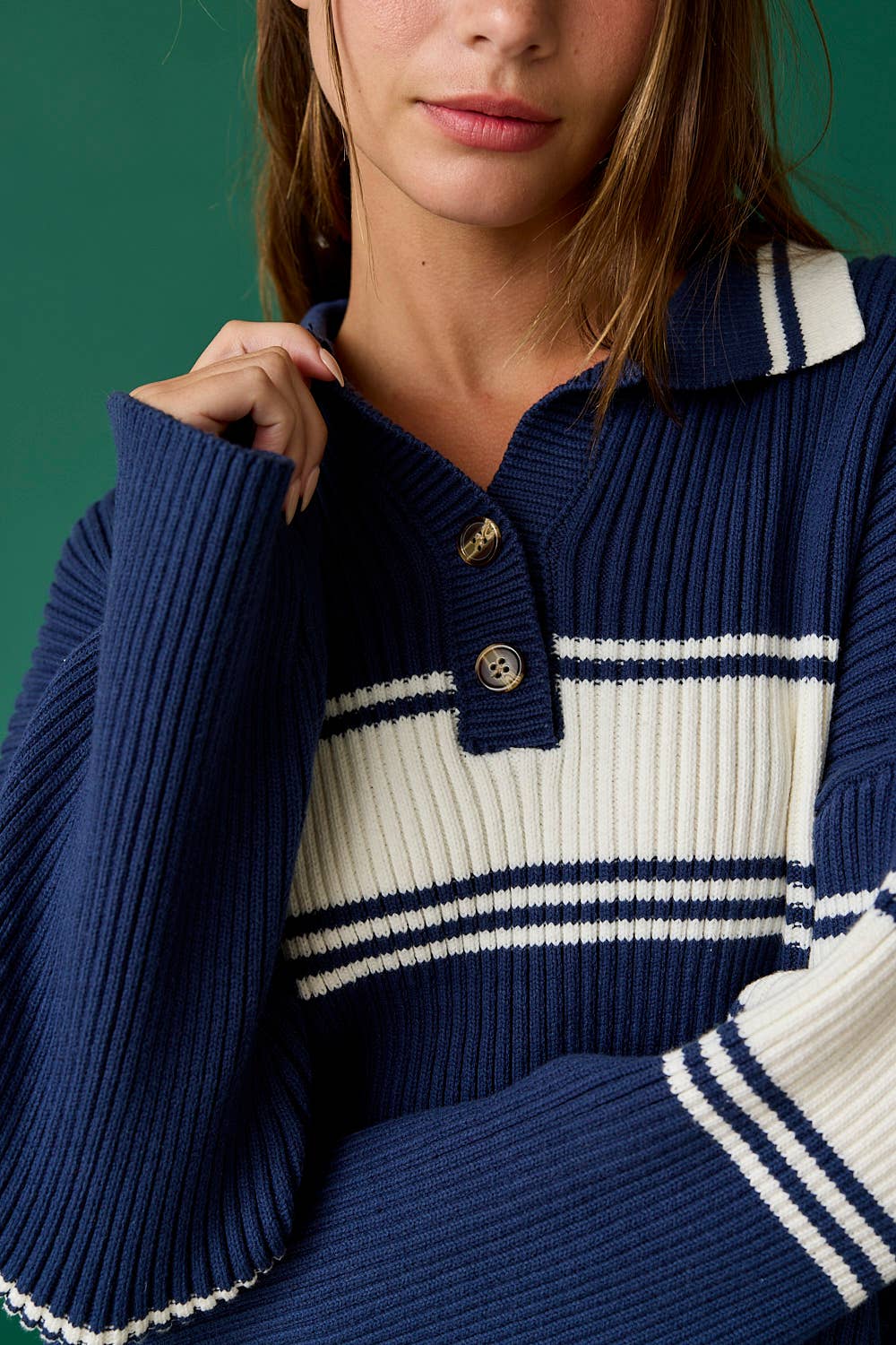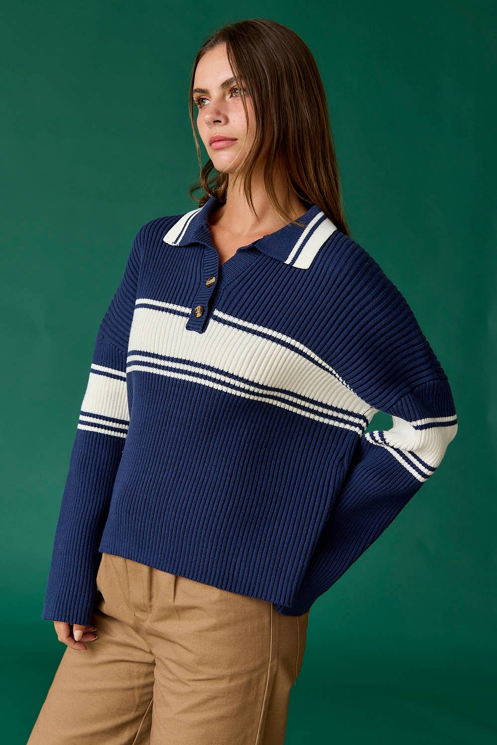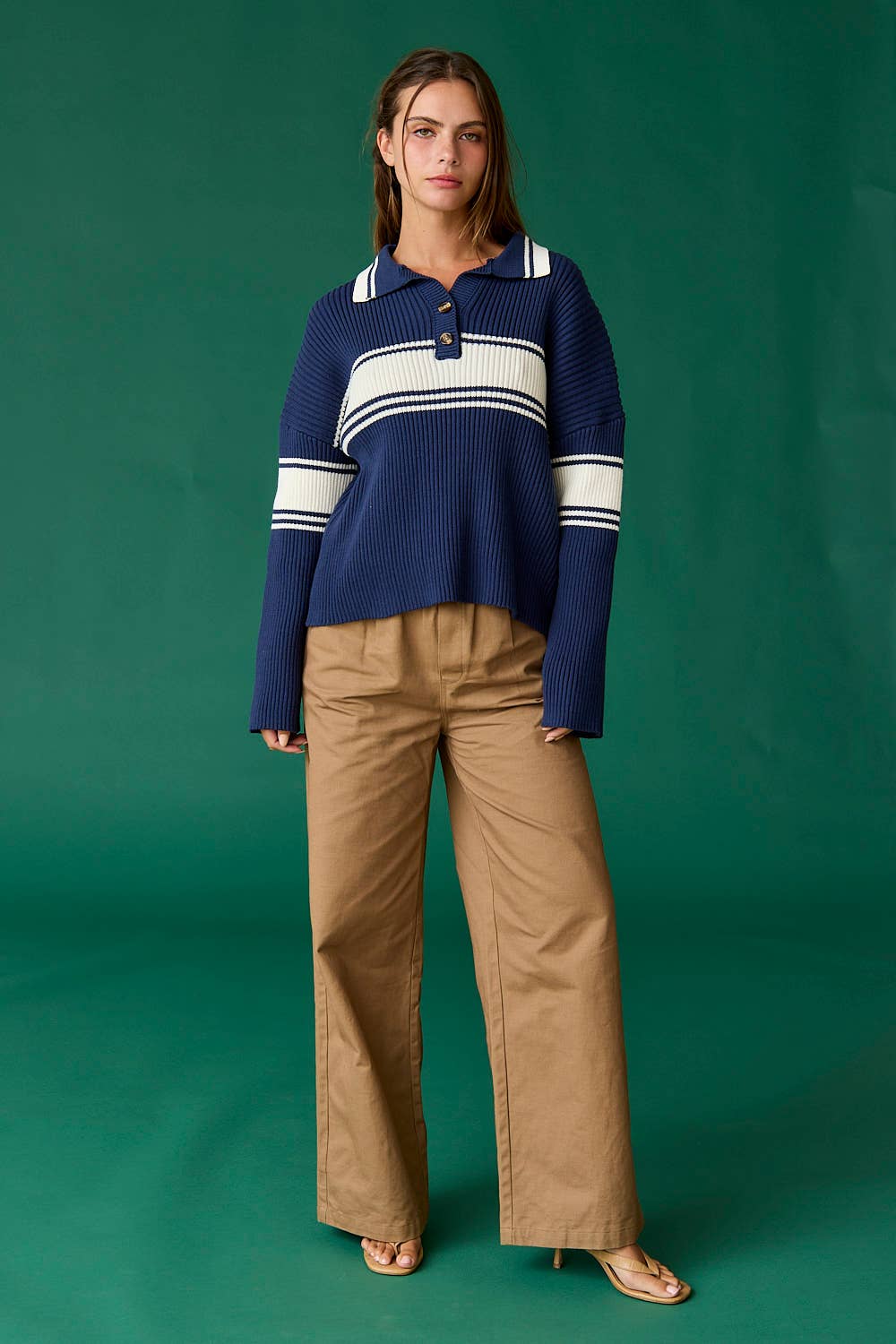 Everly RIbbed Sweater - Oversized - Regular Length - Long Sleeve - Ribbed Knit - Collared - Striped