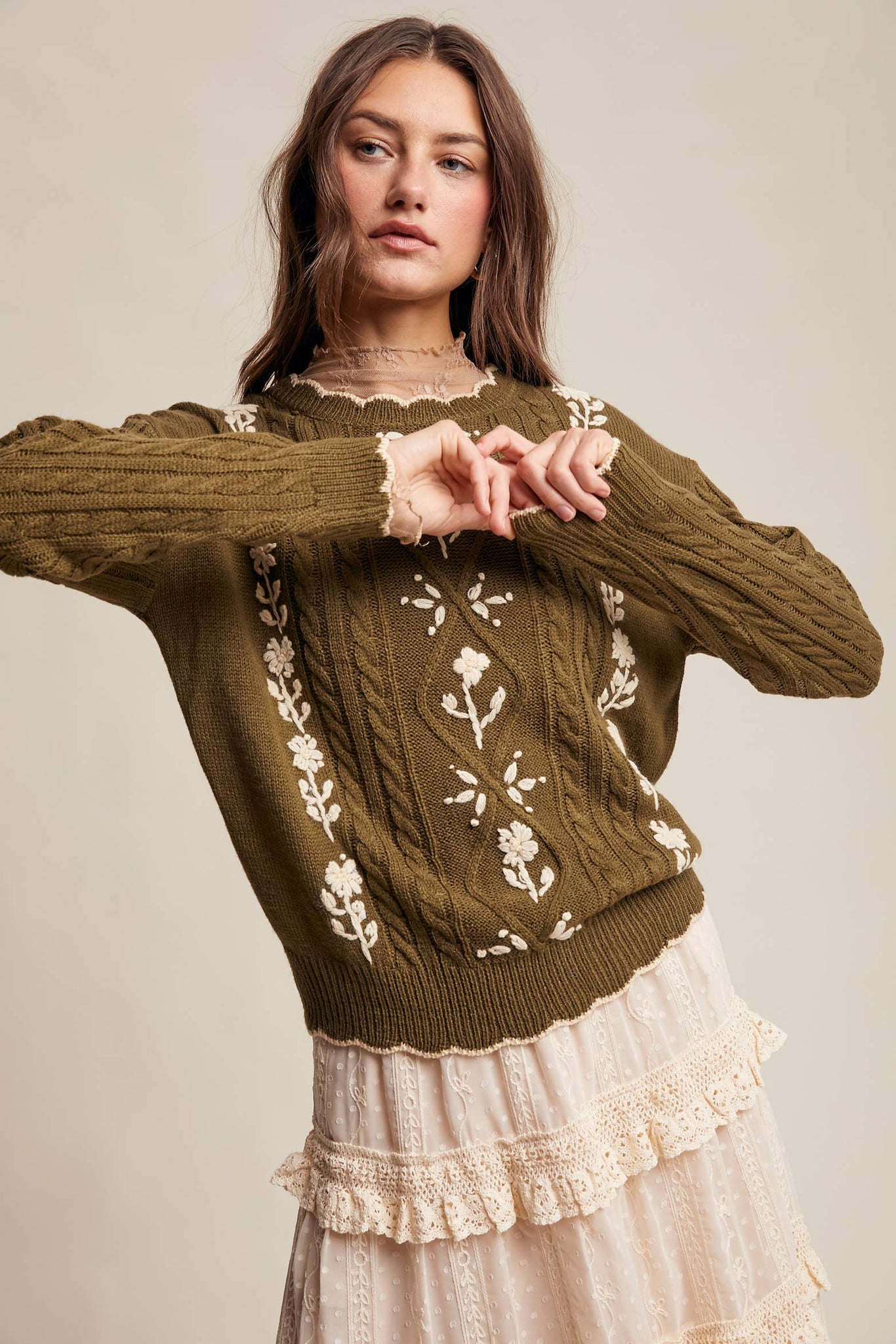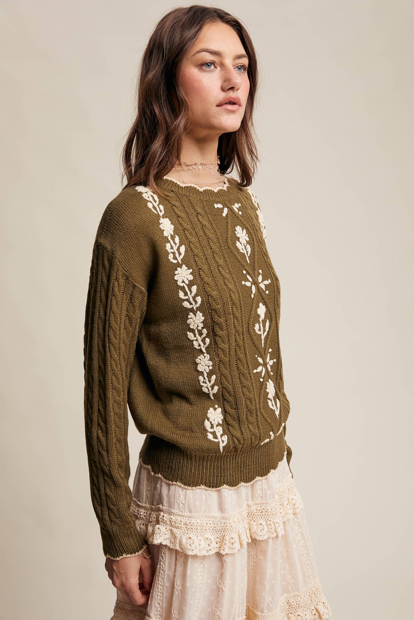 Cozy, mid-weight cable knit for warmth and texture - Floral Embroidery: Cream floral embroidery down the front and sleeves adds a romantic, handcrafted touch - Relaxed Fit: Slightly loose silhouette for comfort and easy layering - Ribbed Trim: Ribbing at cuffs, hem, and neckline for structure and shape retention - Scalloped Hem Detail: Subtle scallop edge at hem adds a sweet vintage finish - Pullover Design: Easy-to-wear crew neckline for everyday styling