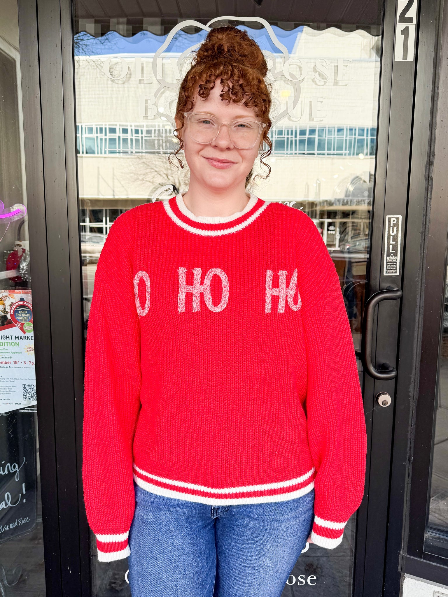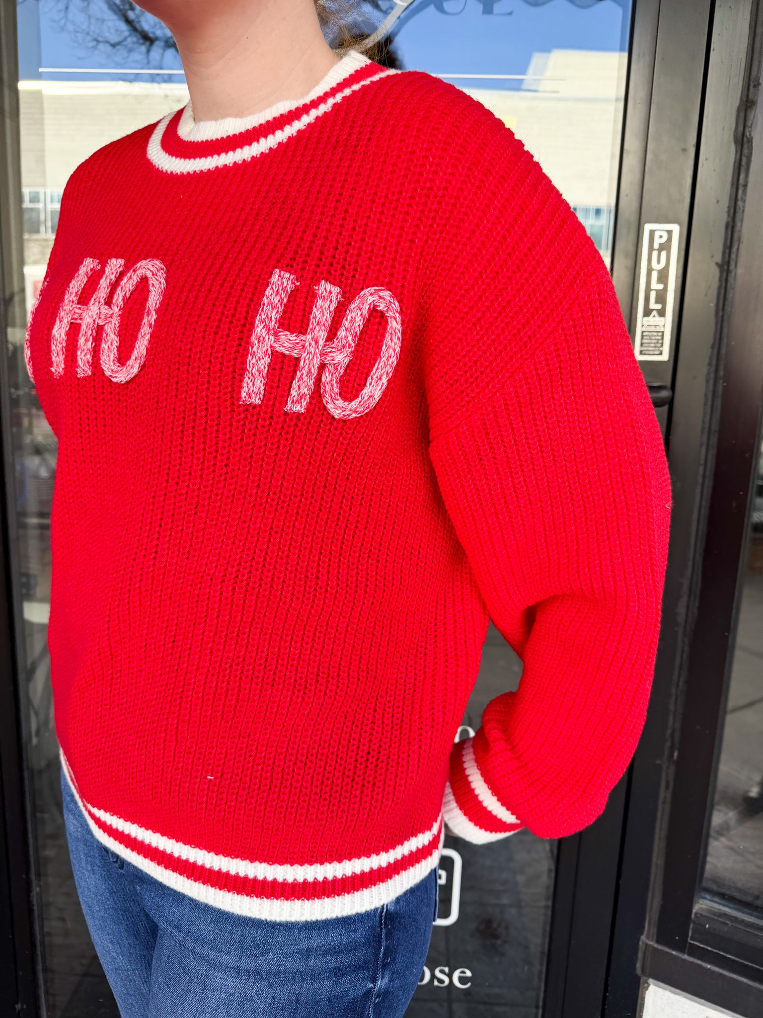 Celebrate the season in festive style with this charming knit pullover sweater. Featuring a classic crew neckline and playful "HO HO HO" graphic, it's the perfect addition to your holiday wardrobe. The striped edge detailing adds visual interest and dimension to this cozy essential. Crafted from quality knit fabric, this sweater delivers both comfort and seasonal cheer for gatherings, casual outings, or relaxed evenings at home.