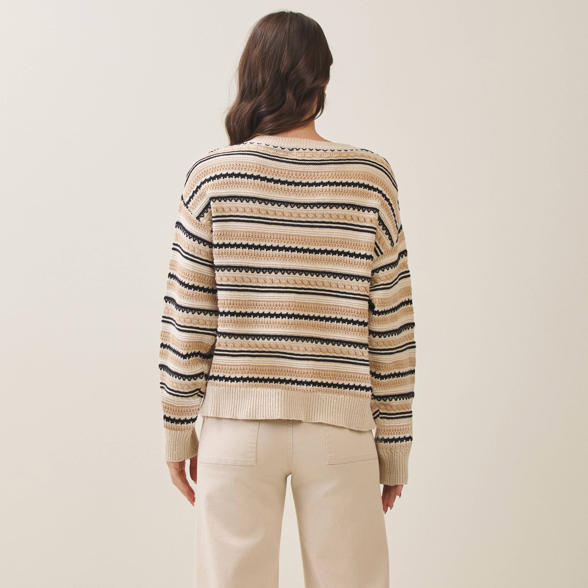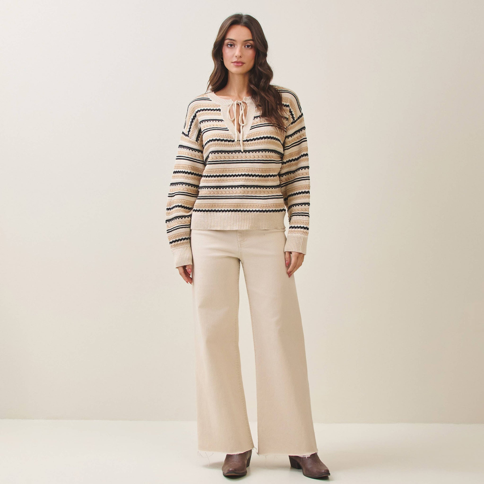 This striped sweater features a cozy, soft fabric and a stylish tie-front design with long sleeves, offering both comfort and a tailored look perfect for layering or standalone wear. Its breathable material ensures all-day warmth without bulk, making it an excellent choice for cooler days.