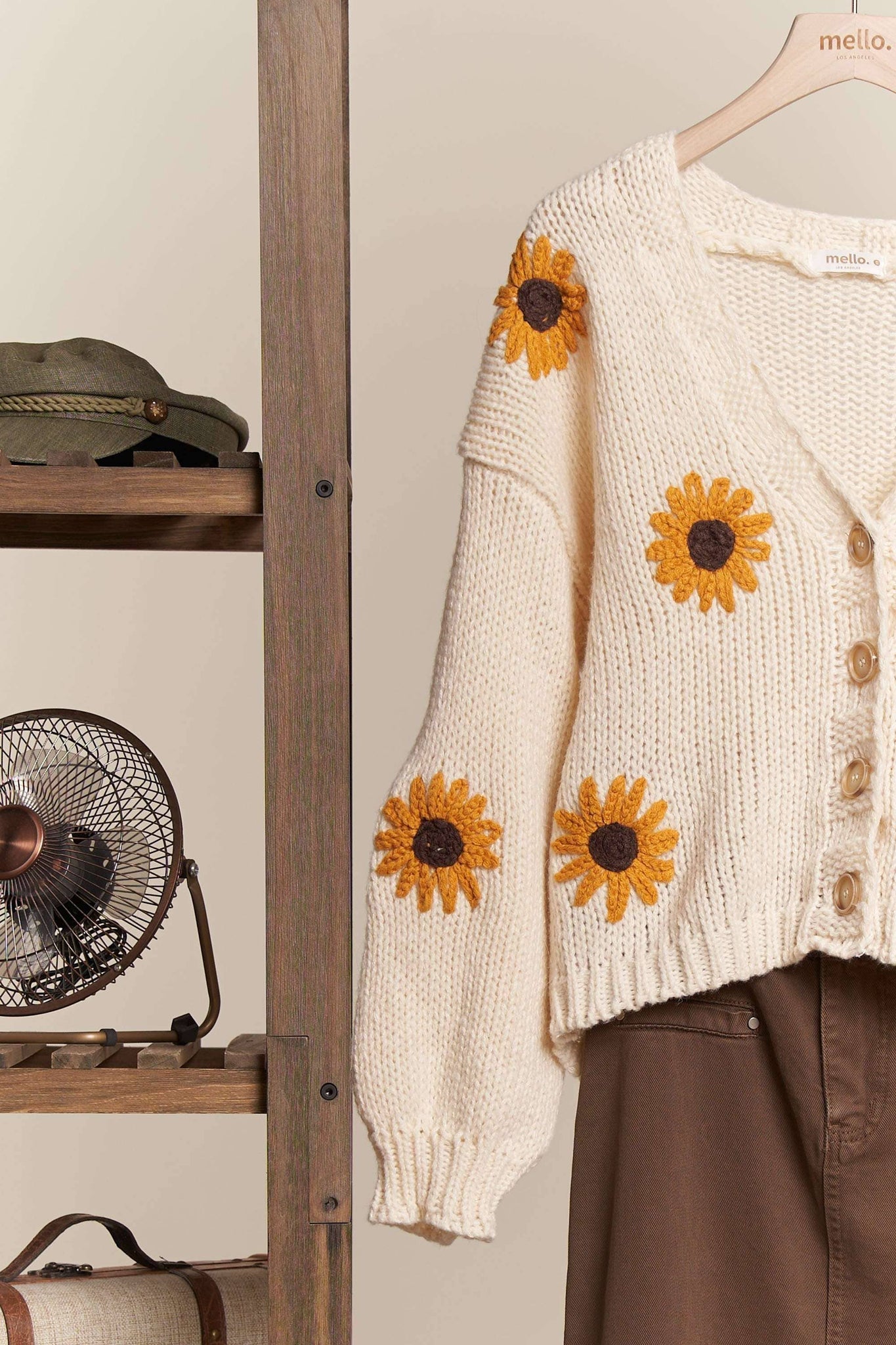 Expertly crafted with a vibrant sunflower embroidery, this cardigan features a stylish button down and a flattering V-neck. Made with soft, high-quality material, it offers both comfort and elegance. Perfect for adding a touch of charm to any outfit.