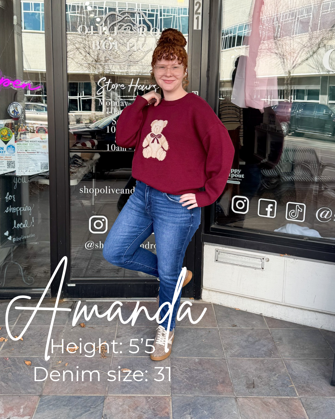 Amanda is wearing a Medium. Wears a size 31 in denim. Height: 5’5
