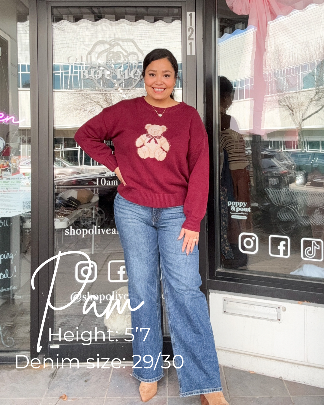 Pam is wearing a Large. Wears a size 29-30 in denim. Height: 5’7