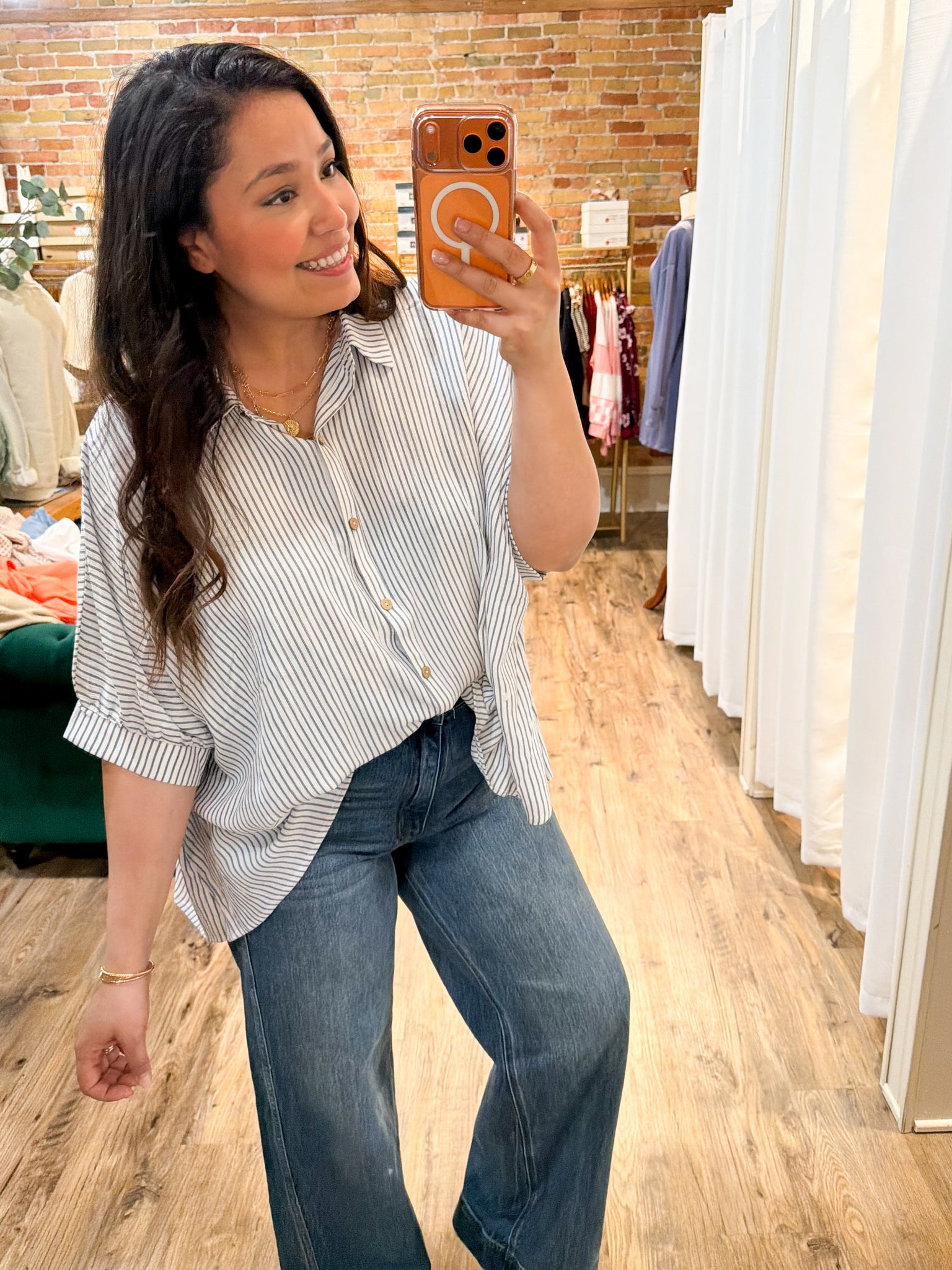 Effortlessly chic, this woven stripe button-down features a relaxed oversized silhouette perfect for layering or wearing solo. The curved hem adds subtle movement, while the front button closure offers easy styling versatility. Crafted for comfort with an approachable boxy fit, it's a wardrobe essential that transitions seamlessly from casual to polished.
