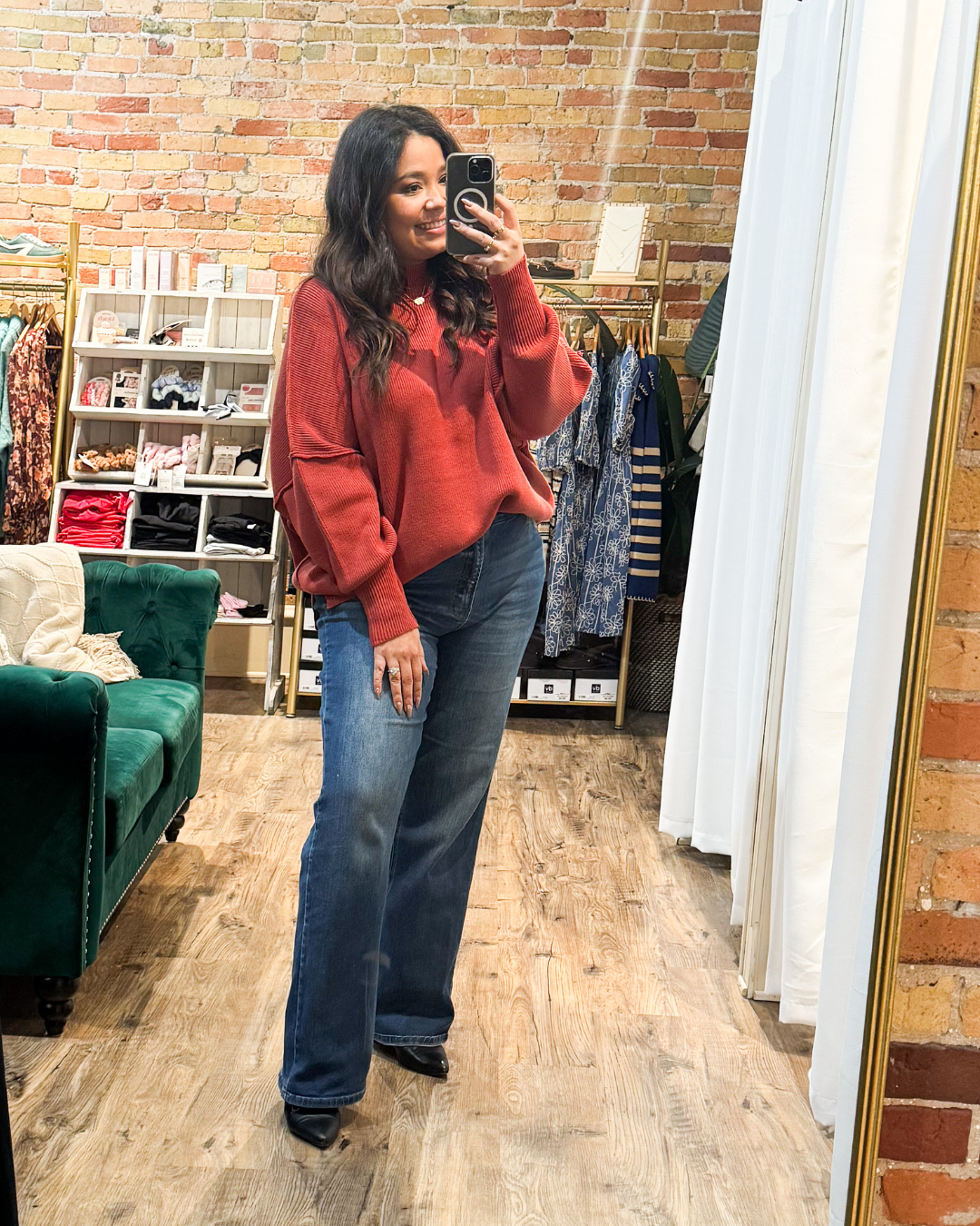 Pam is 5’7, size 29/30 in jeans and is wearing the L/XL. Recommend to size down for a less slouchy fit.